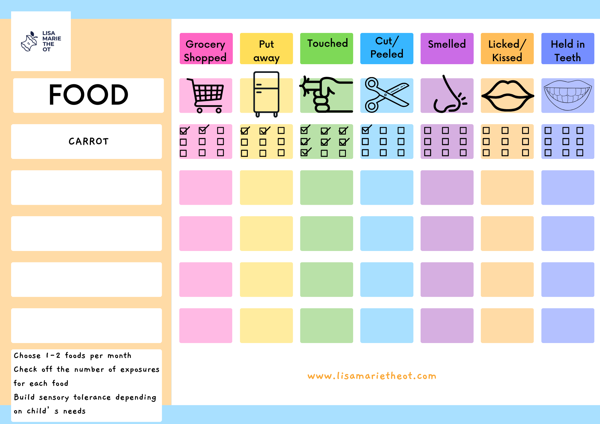 A handout that is great to laminate or screen share for feeding therapy sessions Have children check off what they see, smell, feel and taste, as you explore new foods with them.